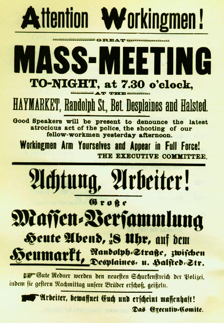 In 1889 the first Congress of the Second International called for international demonstrations in 1890 to mark the anniversary of Chicago protests. May Day as an annual International Workers Day was formally asserted at the International’s Congress of 1891. Riots have broken out on various May Days in the US, notably in Cleveland in 1894 and 1919. Calls have repeatedly gone out for May Day as the start of a General Strike. In many countries workers’ May Day has been recognized as a holiday. Such has not been the case in the US and Canada, where Labor Day (first weekend in September) has been instituted as a workers’ holiday. Indeed in the US Labor Day was explicitly chosen as a workers’ holiday (recognized officially by the administration of President Grover Cleveland) to avoid commemoration of Haymarket and to lessen the possibility of riots. Perversely, given that May Day was often a day for working class demands for universal peace, the state capitalist countries, the Soviet Union, China, and Cuba, have used May Day as a day for mass displays of militarism, with military parades.