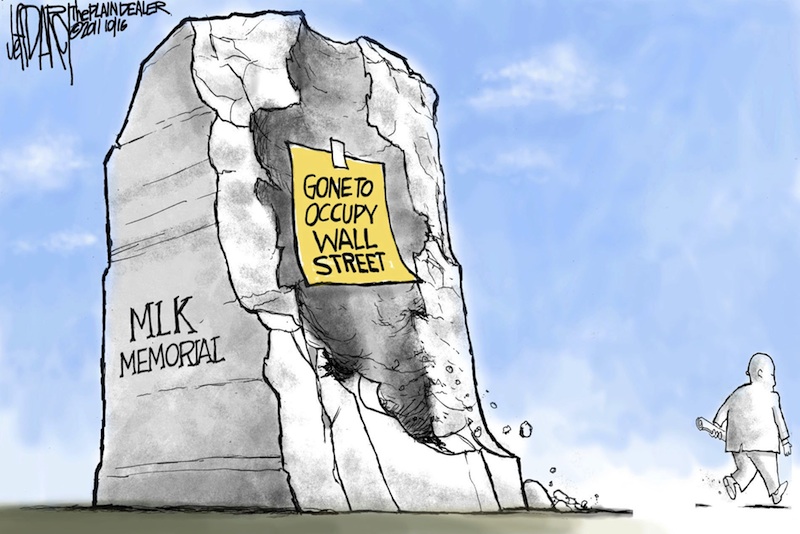 Next, I will begin with the movement that garnered the most attention in the global north, the Occupy Movement. Occupy was inspired by the demonstrations in Tahrir Square in Egypt, but focussed its attention on the massive and increasing inequality produced by three decades of neo-liberal economic policy. It began at the epicentre of neo-liberalism, Wall Street, home to the banks who were the primary beneficiaries of these policies.[8] In their declaration of principles, the occupiers asserted that “on September 17th, 2011,… we as individuals rose up against political disenfranchisement and social and economic injustice. We spoke out, resisted, and successfully occupied Wall Street… constituting ourselves as autonomous political beings engaged in non-violent civil disobedience and building solidarity based on mutual respect, acceptance, and love.” [emphases added].[9] The principles clearly articulate both moments of the spiritual crisis: expression of the pain of being rejected by the institutions of existing society, constructive activity to build a new community of felt belonging amongst the rejected. These themes recur again and again, across the globe.