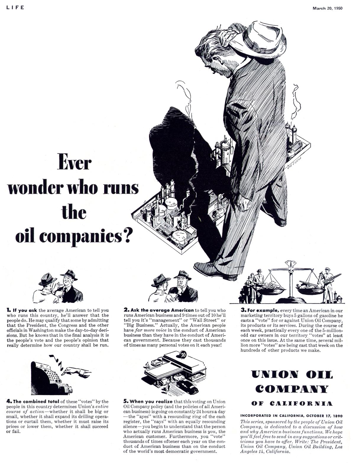 But before we consider who the suppliers are, a methodological precaution: it would be a mistake to assume that modern civilization’s dependence on fossil fuels and the shaping of the world’s carbon created and maintained built environments somehow happened naturally or spontaneously. In other words, in no way should the emergence of this hydrocarbon intensive pattern of capitalist sociality be conceived of as a natural or inevitable development. Rather, the world’s reliance on fossil fuels was created by powerful corporate forces that gained ownership and control over these resources and had a direct interest in commodifying them for profit. This is not to suggest that the owners of carbon energy did not come up against resistance – far from it. But the degree to which modern life and lifestyles are dependent on carbon power – evidenced in the statistics above – suggests how successful this industry and the others it has enabled were at shaping the global field of social reproduction for private accumulation. What is commonly understood as ‘progress’, ‘development’ and ‘modernity’ has been propelled by fossil fuels. And despite calls for alternatives to fossil fuels as early as the 1970s, at every step of the way, the suppliers and their advertisers have done their best to keep the world heavily dependent on the commodity they sell.
