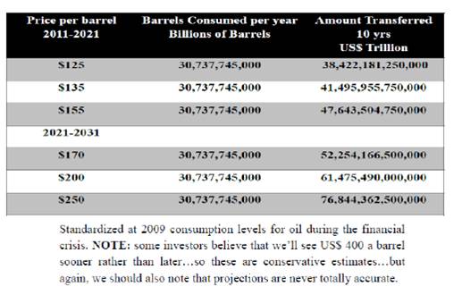 First, since 90% of conventional reserves are owned by states, there will be a massive and unprecedented transfer of wealth from net energy importers to net exporters. Consider, for instance, that from 2001 to 2011 the price of oil increased by 464% on average and redistributed an astronomical income of just over US$ 25 trillion dollars to oil exporters, oil companies and their global investors.[99] This figure, of course, is not pure profit for the oil interests, but the amount spent on global oil consumption. In the two previous decades, the transfer was five times less – about US$ 5 trillion in each decade. The table below considers how much might possibly transfered in the decades to come.
