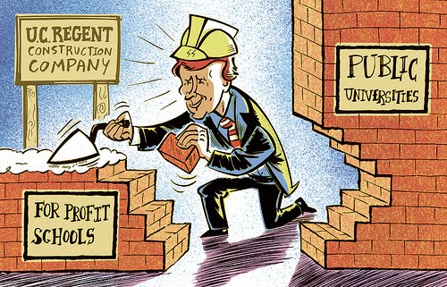 Instead of talking about the relationship between schools and democracy, the new educational reformers call for the disinvestment in public schools, the militarization of school culture, the commodification of knowledge and the privatizing of both the learning process and the spaces in which it takes place. The crusade for privatizing is now advanced with a vengeance by the corporate elite, a crusade designed to place the control of public schools and other public spheres in the alleged reliable hands of the apostles of casino capitalism.[11] Budgets are now balanced on the backs of teachers and students while the wealthy get tax reductions and the promise of gentrification and private schools.[12] In the name of austerity, schools are defunded so as to fail and provide an excuse to be turned over to the privatizing advocates of free-market fundamentalism. In this discourse, free-market reform refuses to imagine public education as the provision of the public good and social right and reduces education to meet the immediate needs of the economy.