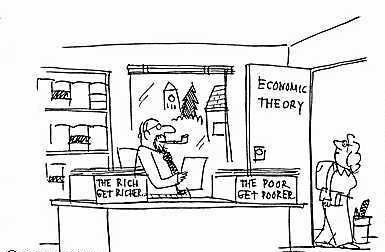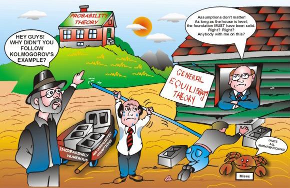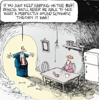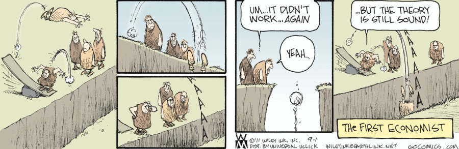 After sanitizing their theories of all that is human and complex about society and the world, the economists insist that their theories hold within their own structures as long as no one upsets them: So the theories hold under all conditions except when imperfections set-in thanks to people and acts of God and whatnot. If it was not for the fact that the world does not operate the way their theories describe, their theories would hold, and that is why they should be accepted – economics is but a reductio ad absurdum wherein its lack of workability, due to the human and external factors impacting it, only implies its veracity and value. From another viewpoint, the theories are valid and sound because they can never be proven to be false: For any attempt to make them false by robust testing would damage the integrity of a theory that in itself is supposedly coherent; what has reality to do with it? Once that is clear, you can then apply these theories as government policies. How this is supposed to be helpful is anyone’s guess.