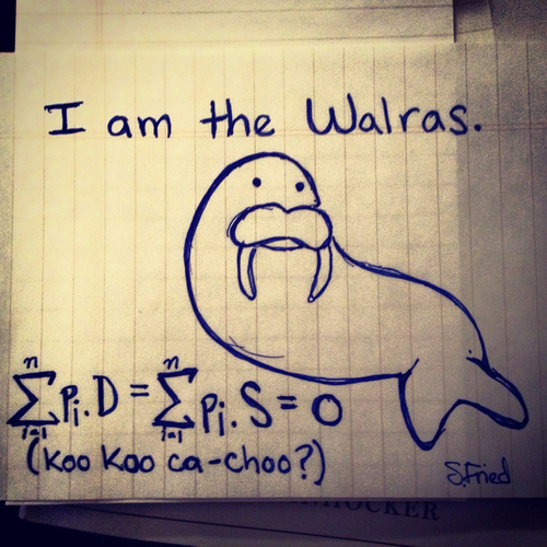 In any case, part of the mythology underlying the general equilibrium idea is that of Adam Smith’s inadvertently notorious ‘invisible hand’. For an assumption that undergirds equilibrium is that “…only the market, is able actually to lead the economy towards a state of equilibrium. It must only be the market, and not any social institution or collective agent” that brings this equilibrium/stability (Screpanti and Zamagni 391). In the same paragraph we are told in effect that Walras thought he had worked his way out of invisible forces but only relegated them further into his assumptions by thinking that “he had ’solved’ [it] by assuming that the tatonnement process is regulated by the ghost-like presence of an ‘auctioneer’” – which only makes the spectral entity conjured by tatonnement an ontological necessity.