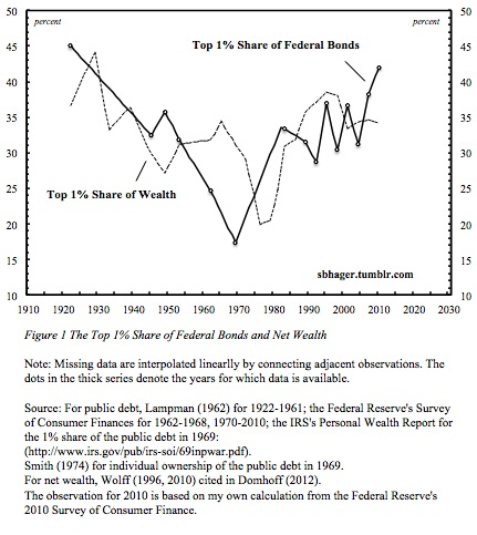 Both series follow the same general pattern. During the 1920s, the top percentile’s share of the public debt and wealth were both over 40%. Over the next half-century both of these shares fell gradually before beginning an upward ascent around the 1970s.[4] By 2010, while the top 1% share of wealth had tapered off and declined slightly, the share of the public debt owned by the top 1% breached the 40% mark for the first time since the 1920s.