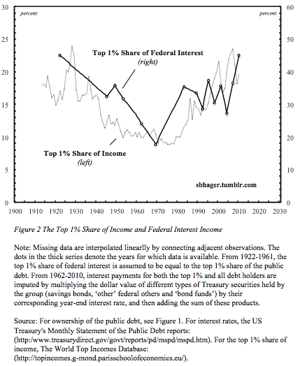 My purpose in this article is to go beyond the current debate over America’s ‘debt dilemma’ and explore these questions. To this end, I present long-term historical research that empirically maps the share of the public debt owned by the top 1% of US households. This research demonstrates that, over the past century, inequality in the ownership of federal bonds and in the interest that is paid on them runs closely to the U-shaped pattern that characterizes the overall distribution of wealth and income. Over the past three decades, and especially in the context of the current crisis, the top 1% share of federal debt and interest has increased at a stunning rate and is now approaching the historic highs of the 1920s. This concentrated pattern of ownership suggests that since the early 1980s the public debt has come to serve more and more as an institution of power that works in the interests of the top 1%.