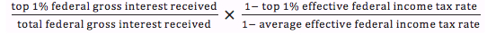 A progressive federal income tax system will make the net interest share of the top 1% smaller than its gross interest share (the difference between the gross and net shares will be positive). A regressive federal income tax system will make the net interest share of the top 1% greater than its gross share (the difference between the gross and net shares will be negative). A neutral federal income tax system will keep the gross and net interest share of the top 1% the same. In other words, the more progressive the tax system, the greater the gap will be between the gross and net share of federal interest received by the top 1% (and vice versa).
