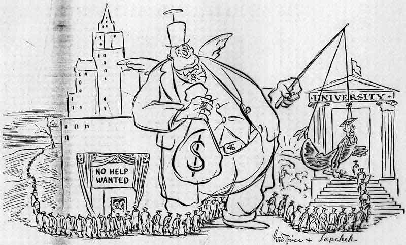 In this new Gilded Age of money and profit, academic subjects gain stature almost exclusively through their exchange value on the market. Pharmaceutical companies determine what is researched in labs and determine whether research critical of their products should be published. Corporate gifts flood into universities making more and more demands regarding what should be taught. Boards of Trustees now hire business leaders to reform universities in the image of the marketplace. For-profit universities offer up a future image of the new model of higher education, characterized by huge salaries for management while a mere “17.4 per cent of their annual revenue spent on teaching, while 20 per cent was distributed as profit (the proportion spent on marketing [is] even higher).”[16] Offering subprime degrees devoid of any sense of civic purpose, large numbers of students from many of these for-profit institutions never finish their degree programs and are saddled with enormous debts. As Stefan Collini observes, at the University of Phoenix, owned by the Apollo Group, “60 percent . . . of their students dropped out within two years, while of those who completed their courses, 21 per cent defaulted on paying back their loans within three years of finishing. [Moreover], 89 percent of Apollo’s revenue comes from federal student loans and [Apollo] spends twice as much on marketing as on teaching.”[17]
