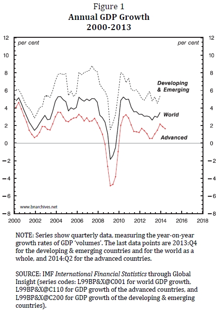 Figure 1 provides the broad context. The chart is a snapshot of the ‘state of the world economy’ since the beginning of the systemic crisis in the early 2000s. The figure shows three annual GDP growth rates: (1) the dotted red line is for the advanced countries, (2) the dashed line is for the developing world, and (3) the solid line is for the world as a whole. We can see the first downturn in 2000-2002. The developing world and emerging markets recovered briskly from this decline, but the advanced countries showed a very feeble recovery. Then came the 2008-9 drop. This downturn was much more serious (–5 per cent for the developed world and –3 per cent for the world as a whole), and the recovery from it limited and brief. By 2010, both regions – and the world as whole – began to decelerate rapidly.