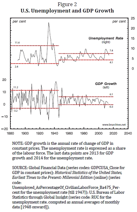 The historical record seems to confirm this view. Figure 2 shows the U.S. rate of unemployment and GDP growth since the late 1880s. Unemployment is plotted against the right-hand scale and GDP growth against the left-hand scale. The data are divided into two sub-periods: until 1946 and from 1946 onward.