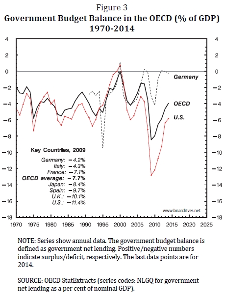 On the fiscal side, policymakers have let budget deficits skyrocket. Figure 3 shows the budget balance in the OECD countries, with positive numbers indicating a surplus and negative numbers showing a deficit. We can see that, since the early 1990s, with monetarist neoliberalism in full swing, deficits tended to shrink, and that in some countries they reverted to small surpluses. But the first crash of the millennium, in 2000, reversed that trend, and in 2008, it was as if all hell had broken loose. The average OECD government deficit rose to nearly 8 per cent of GDP, and in the U.S., the bastion of neoliberalism, the deficit reached 12 per cent.