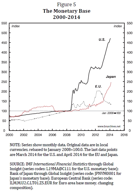 This process is shown in Figure 5. The graph plots the monetary base – which measures the amount of notes and coins in circulation – in the United States, the European Union and Japan. The numbers are denominated in local currencies and normalized to January 2008=100 so they can be compared easily.