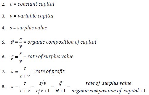 To see why this is so, let us review the basic Marxist accounting in Equations 2-8 below. Begin with c, v and s, which are measured in terms of socially necessary abstract labour time. If we denote constant capital by c, variable capital by v and surplus value by s, we can express the following three relationships. The organic composition of capital θ is the ratio of c/v; the rate of surplus value ξ is the ratio of s/v; and the rate of profit π is the ratio of s/(c+v). If we now divide the numerator and denominator of the rate of profit by v, we can express the rate of profit π as a ratio between the rate of surplus value ξ and the organic composition of capital θ plus 1.[6]