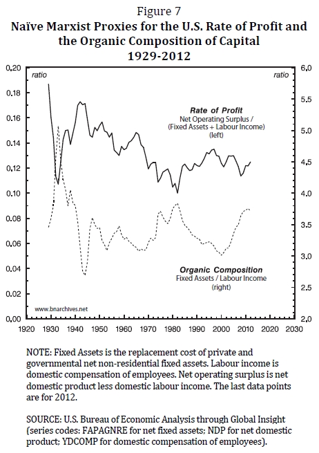 Figure 7 takes a naïve perspective. It is naïve because in this chart we do not pretend to be able to distinguish productive from unproductive labour, and instead assume, contrary to most Marxists, that all economic activity is productive of surplus value. The dashed line approximates the organic composition of capital. It is estimated by taking the ratio between the current (replacement) dollar cost of all non-residential fixed assets and the dollar value of employee compensation. The solid line measures the Marxist rate of profit, computed as the ratio of net operating surplus (which is net domestic product less employee compensation) and the sum of the current dollar cost of fixed assets and employee compensation.[7]