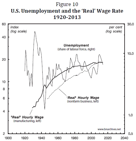 But the connection to Marx’s theory here, although intuitively appealing, is ultimately misleading. For Marx, the significance of the reserve army lies in its impact not on the rate of change of the real wage, but on its absolute level. Figure 10 examines this latter impact, and the picture it depicts is very different from that of Figure 9. The chart shows the rate of unemployment against the right log scale and the real wage level against the left log scale. We use two real-wage series – for production workers in manufacturing only and for all workers in the nonfarm business sector. Both series are expressed as indices.