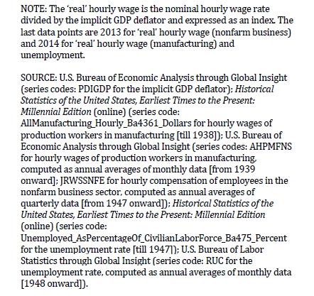 The relationship shown in the figure is rather remarkable. We can discern three distinct periods, indicated by the dashed, freely drawn line going through the employment series. The first period, from the turn of the century till the 1930s, is the so-called Gilded Age. Income inequality is rising (at least during the period for which data are available) and employment growth is plummeting.