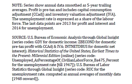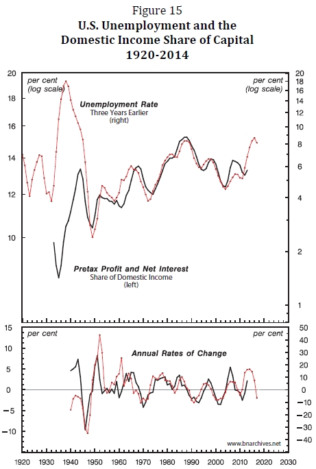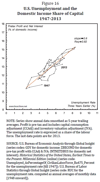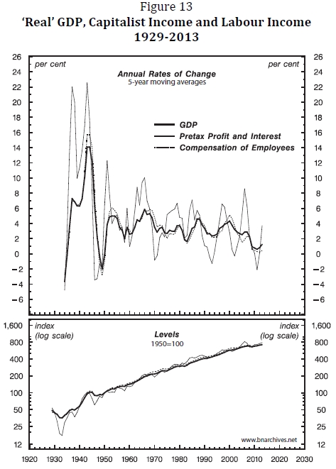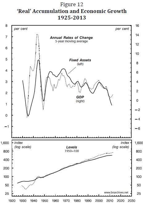 And that is what we see in Figure 12. The bottom panel of the figure shows the level of the U.S. real capital stock and GDP since 1929, while the top panel shows their respective rates of growth smoothed as 5-year trailing averages. Both the levels and rates of change of the two magnitudes move in tandem. And if we take the top panel at face value, our conclusion would be that the current crisis comes at the tail end of a prolonged deceleration that began in the late 1960s and has recently culminated in a near breakdown.