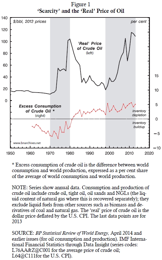 The bottom series in Figure 1 is the conventional proxy for the scarcity of oil. This proxy is computed by subtracting global oil production from global oil consumption and expressing the result as a per cent share of the average of these two magnitudes. Assuming that consumption is equal to demand and production to supply, positive observations on the chart represent excess demand (inventory depletion), while negative observations denote excess supply (inventory build-up).
