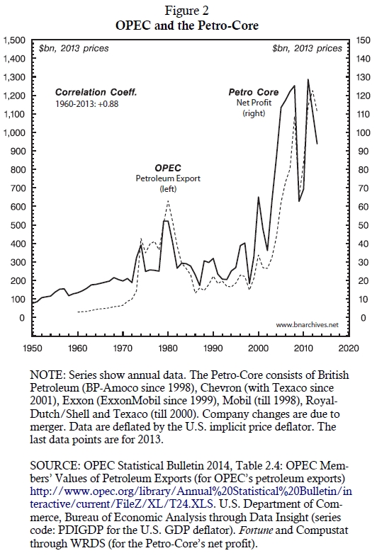 The converging performance of these two groups – the integrated oil companies and the oil-producing countries – is illustrated in Figure 2.[16] The chart, expressed in constant 2013 dollars, contrasts the total oil exports of OPEC with the net profit of the ‘Petro-Core’, a name we devised to denote the world’s leading private integrated oil companies. During the early 1960s, this core comprised six firms – British Petroleum, Chevron, Exxon, Mobil, Royal-Dutch/Shell and Texaco. The 1999 merger of Exxon and Mobil into ExxonMobil reduced this number to five, and the 2001 absorption of Texaco by Chevron truncated it further to four (which is the current situation).[17]