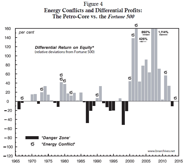 [31] It is important to note here that the energy conflicts have led not to higher oil profits as such, but to higher differential oil profits. For example, in 1969-70, 1975, 1980-82, 1985, 1991, 2001‑02, 2006-07, 2009 and 2012, the rate of return on equity of the Petro‑Core actually fell; but in all cases the fall was either slower than that of the Fortune 500 or too small to close the positive gap between them, so despite the decline, the Petro‑Core continued to beat the average.