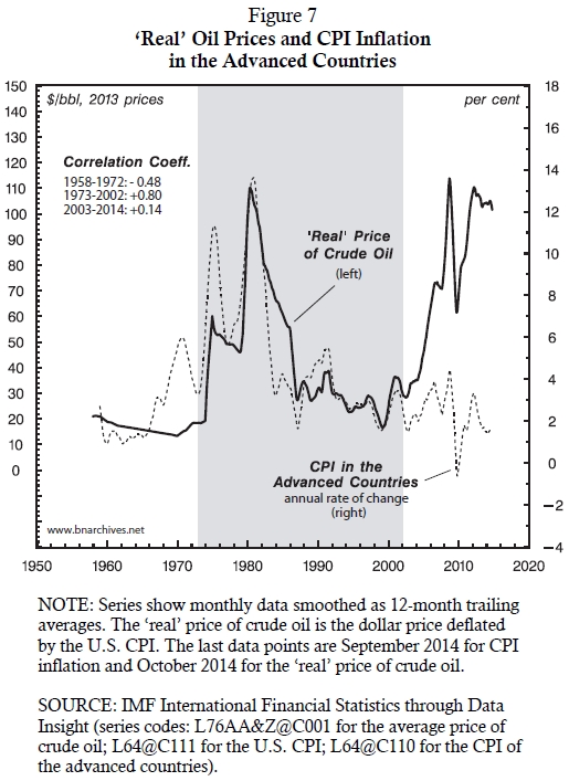 [45] While the correlation between inflation and the level of ‘real’ crude oil prices dropped to a negligible 0.14, the correlation between inflation and the rate of change of ‘real’ crude oil prices remains high at 0.78.