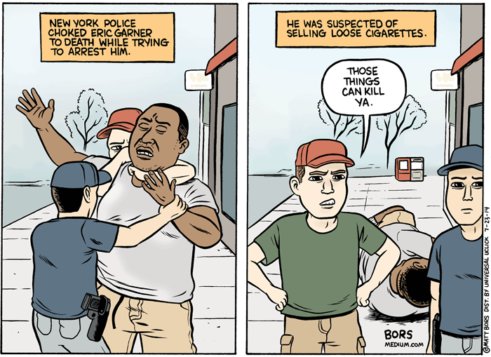 In the advent of the recent display of police force in Ferguson, Missouri and Baltimore, Maryland it is unfair to view the impact of the rapid militarization of local police on poor black communities as nothing short of terrifying and symptomatic of the violence that takes place in authoritarian societies. For instance, according to a recent report produced by the Malcolm X Grassroots Movement entitled Operation Ghetto Storm, ‘police officers, security guards, or self-appointed vigilantes extra judicially killed at least 313 African-Americans in 2012…This means a black person was killed by a security officer every 28 hours.’ Michelle Alexander adds to the racist nature of the punishing state by pointing out that “There are more African American adults under correctional control today — in prison or jail, on probation or parole — than were enslaved in 1850, a decade before the Civil War began.”[8] Meanwhile the real violence used by the state against poor minorities of color, women, immigrants, and low income adults barely gets mentioned, except when it is so spectacularly visible that it cannot be ignored as in the cases of Eric Garner who was choked to death by a New York City policeman after he was confronted for illegally selling untaxed cigarettes. Or the case of Freddie Gray who had his spine severed and voice box crushed for making eye contact with a cop. These cases are not exceptional. For too many blacks, the police have turned their neighborhoods into war zones where cops parading as soldiers act with impunity.