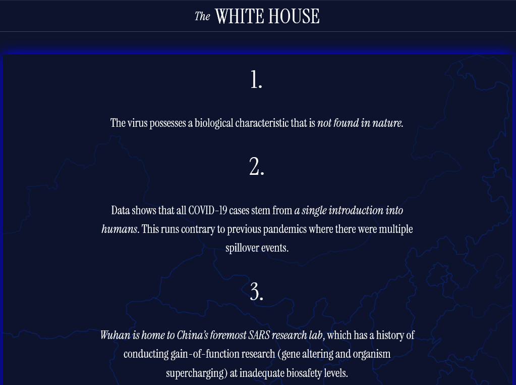 The Chinese first reported the outbreak in December 2019 and insisted that it came from a wet market in Wuhan—a natural or ‘zonotic’ transfer from bats sold at the market. Others were skeptical and pointed to the nearby Wuhan government virus lab, known to have conducted coronavirus studies with bats. This lab had a history of safety and contamination concerns.
