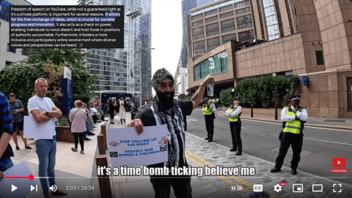 I am here because this is wrong. I am only here to save my kids’ future, your kids’ future. I took asylum in this country three decades ago. I ran from these people and today they are here again. No more. We are here. I’m not running again. No more. They are here to kill you…Sorry for my language, but this is the truth. You should know that because I am from the same land they come from. They are barbarians…They will pretend they are good. They will pretend they are very happy. Once they have got established, they will f—g kill you. They are the time bomb… Believe me, it’s coming from the brown man [referring to himself] from the same land. It happened to us in Afghanistan. It will happen here again. Believe me or don’t believe me. I am here for the future of my kids, your kids. I had to repay back the country [Britain] who gave me everything. Thank you.