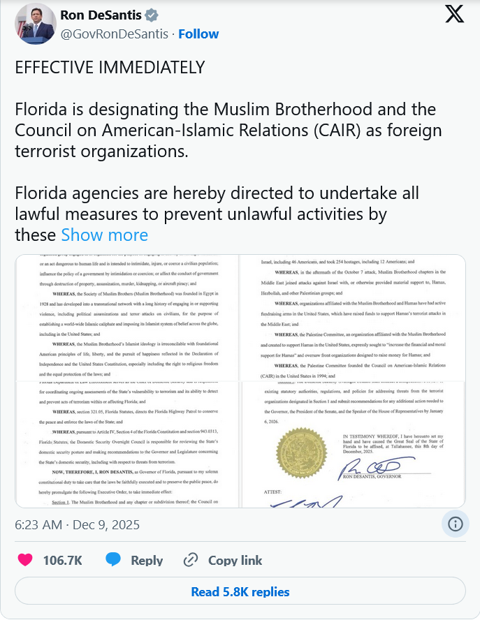 The Muslim Brotherhood and the Council on American-Islamic Relations (CAIR) as foreign terrorist organisations and transnational criminal organisations. This designation authorizes heightened enforcement against both organisations and their affiliates and prohibits them from purchasing or acquiring land in Texas.