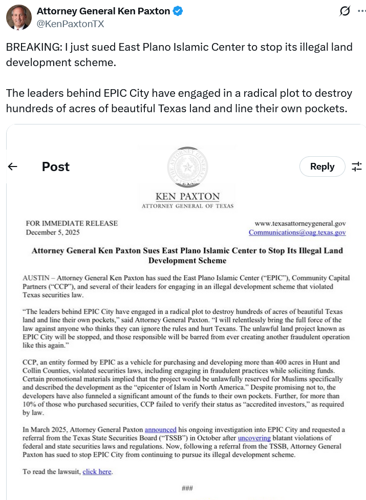 Texas Attorney General Ken Paxton has filed a lawsuit against the East Plano Islamic Center (EPIC), Community Capital Partners (CCP), and several of their leaders, alleging that they engaged in an illegal land development scheme that violated Texas securities laws.